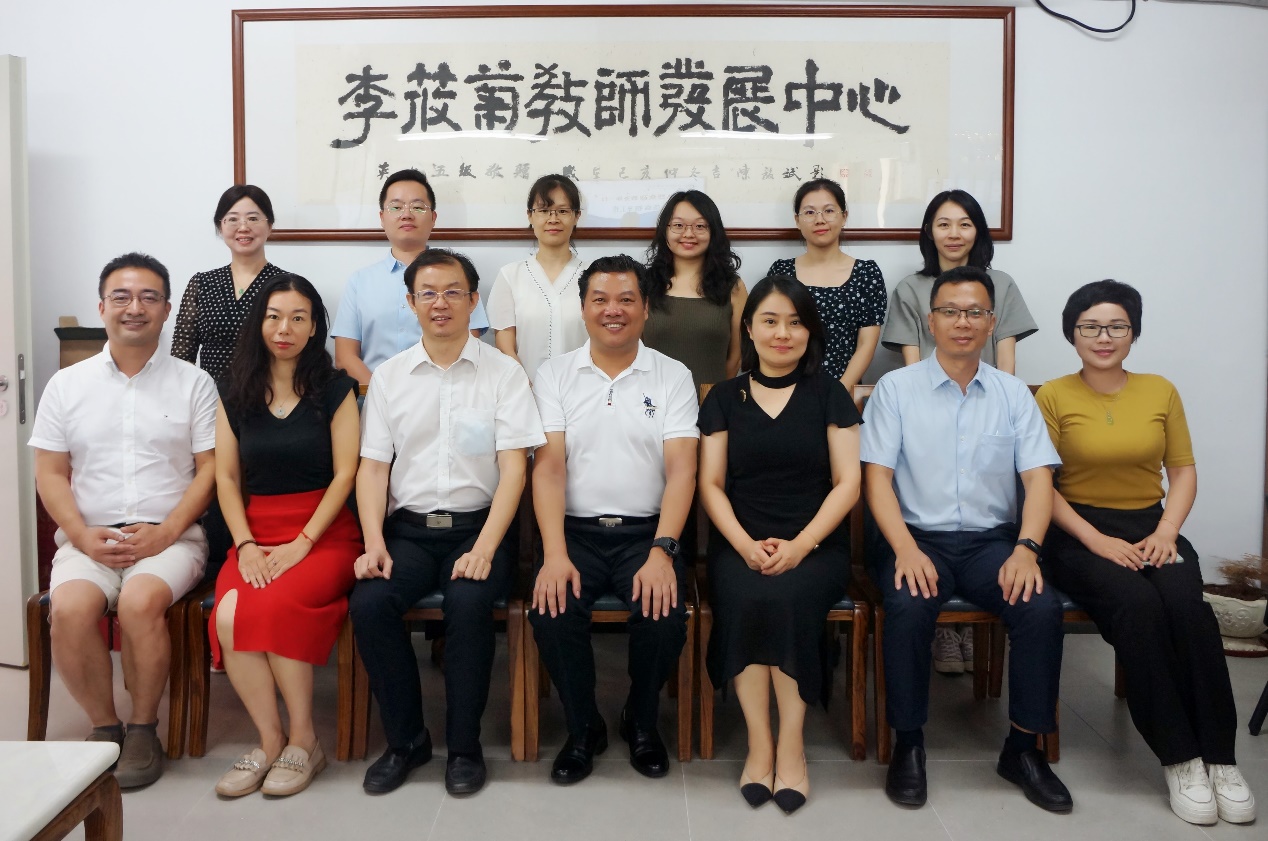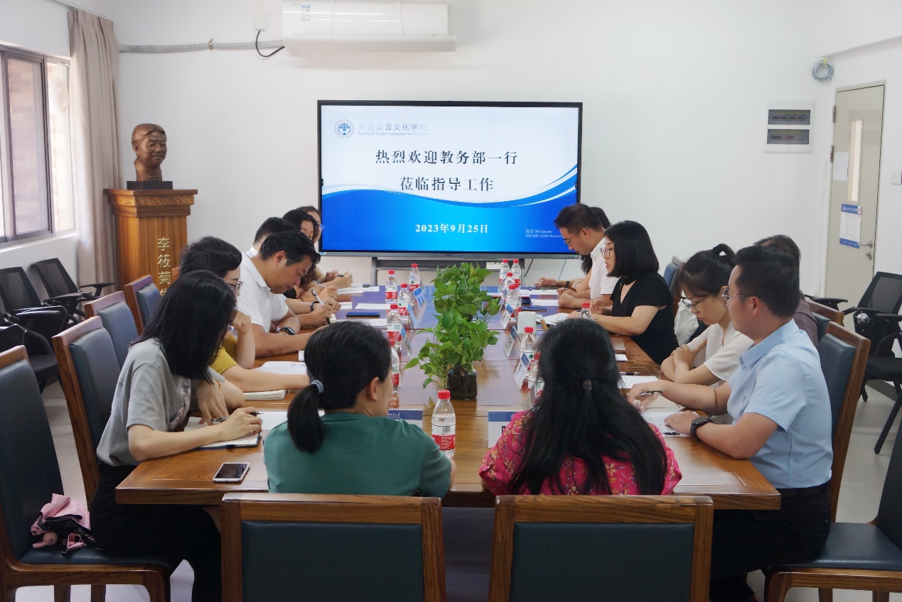 本网讯 2023年9月25日下午,在白云山校区第一教学楼446会议室,教务部部长陈金诗一行前来英文学院调研专业内涵建设情况,英文学院院长张欣、党委书记王则唐和副院长吴庄等出席调研座谈会。